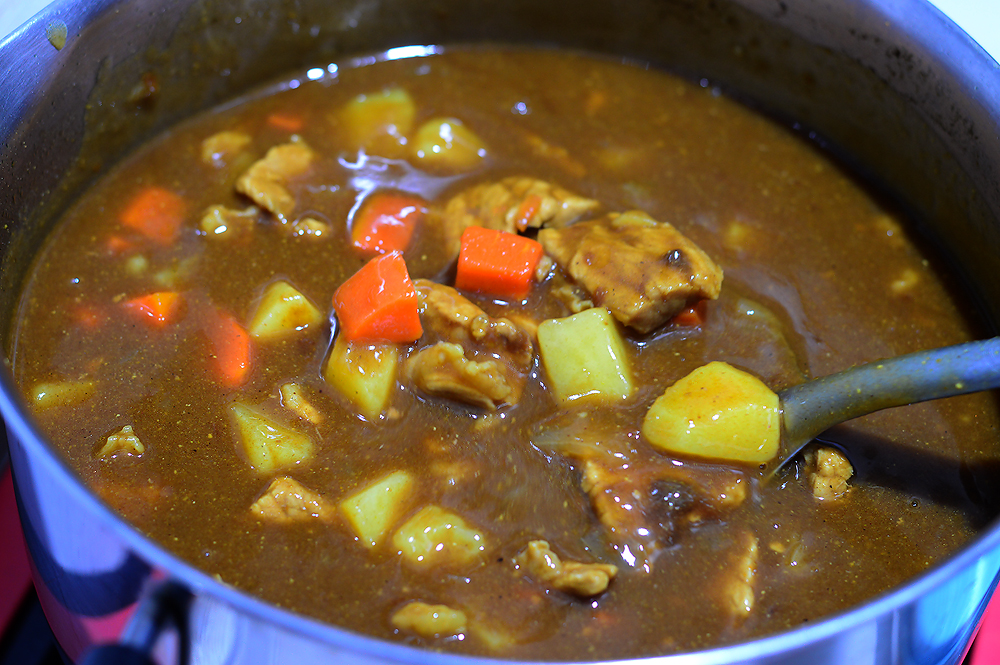 ผัดให้สุกพอประมาณ แล้วเติมน้ำลงไป จากนั้นใส่หัวหอมใหญ่ แครอท มันฝรั่ง ตั้งไฟปานกลาง แล้วตั้งเอาไว้นาน 30 นาทีหรือจนผักนุ่มสุก น้ำในหม้อจะลดลงเล็กน้อย เติมน้ำผลไม้ลงไปเพื่อเพิ่มรสชาติของผักและผลไม้ ใครไม่ชอบไม่ต้องใส่ก็ได้ครับ - ปรุงรสเค็มด้วยโชยุ ปรุงรสเผ็ดด้วยพริกป่น